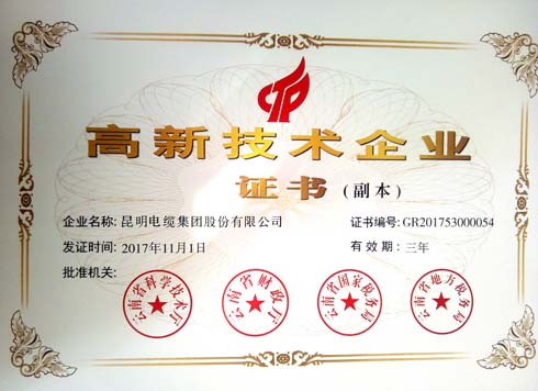 2017年12月,昆明電纜集團(tuán)股份有限公司再次通過(guò)了高新技術(shù)企業(yè)的認(rèn)定,被云南省科學(xué)技術(shù)廳、云南省財(cái)政廳、云南省國(guó)家稅務(wù)局、云南省地方稅務(wù)局認(rèn)定為“高新技術(shù)企業(yè)”。